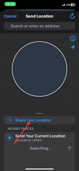 - Anschließend erscheint ein Bildschirm mit einer Karte, die Ihre aktuelle GPS-Position anzeigt, und einigen Optionen. Wählen Sie Live-Standort teilen.